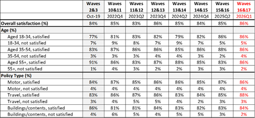Overall consumer satisfaction with insurers rose to 86% in 2026Q1, returning to its highest recorded level since the survey began in 2019. Consumers said insurers had performed better across all nine survey themes for the second consecutive survey, with greater improvements in the areas of ‘loyalty’ (getting a fair deal), ‘confidence’, and ‘ease of doing business’. While consumers still consider ‘loyalty’ as the area with greatest opportunity to improve, the figure is now at an historical low, having fallen for three consecutive waves.